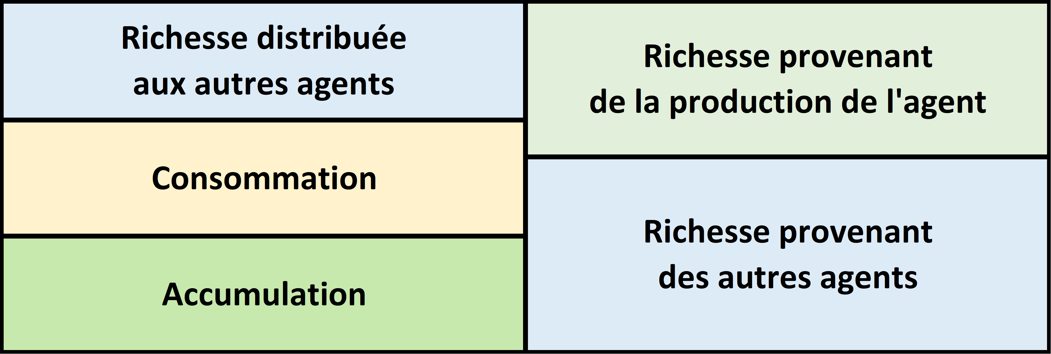Mais une deuxième contrainte de cohérence s’impose aussi : si l’on considère l’ensemble des agents économiques, la richesse provenant des autres agents est nécessairement égale à la richesse distribuée aux autres agents.