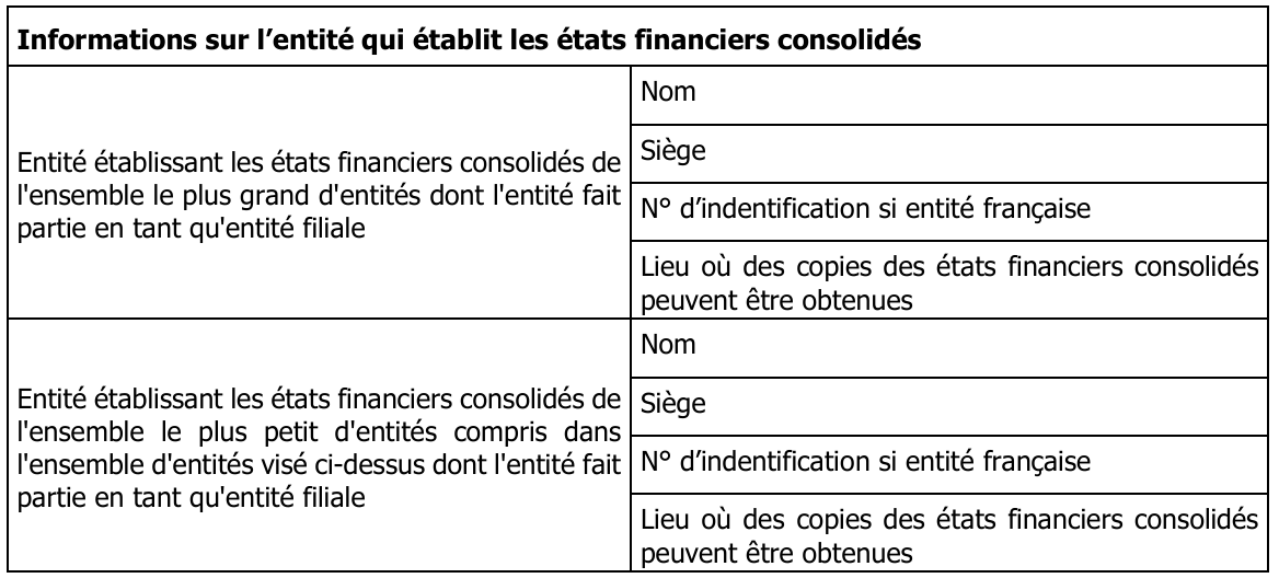 1. le nom et le siège de l’entité qui établit les états financiers consolidés de l'ensemble le plus grand d'entités dont l’entité fait partie en tant qu'entité filiale en indiquant pour les entités françaises le numéro d’identification ;