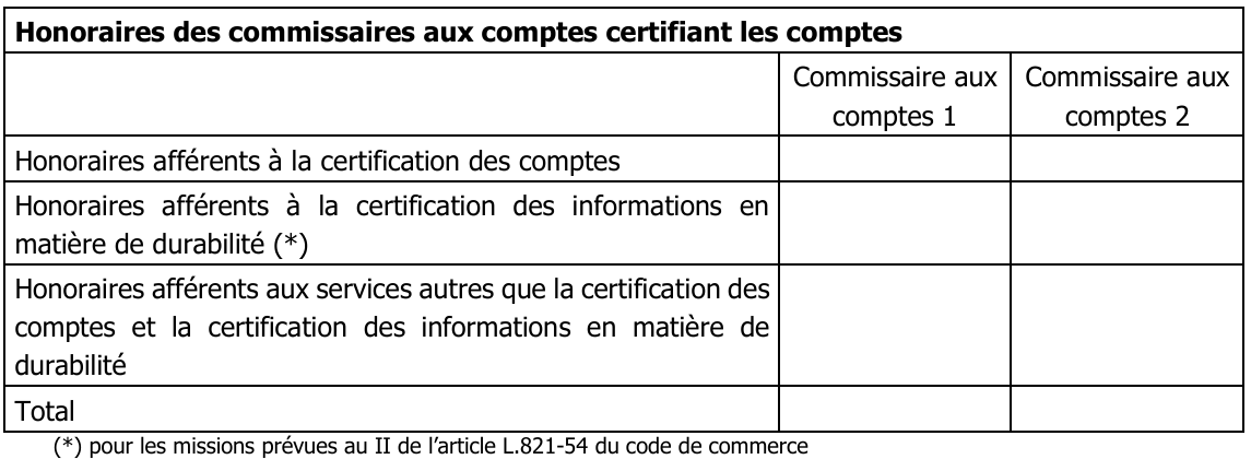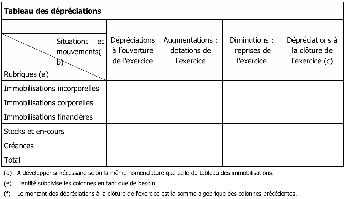 Pour renseigner les informations exigées aux points 1 à 5 du présent article, l’entité utilise les tableaux suivants.