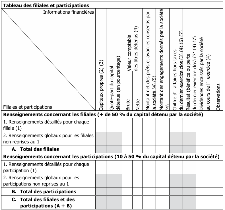L’annexe inclut un tableau des filiales et participations requis par l’article L. 233-15 du code de commerce selon le modèle suivant :
